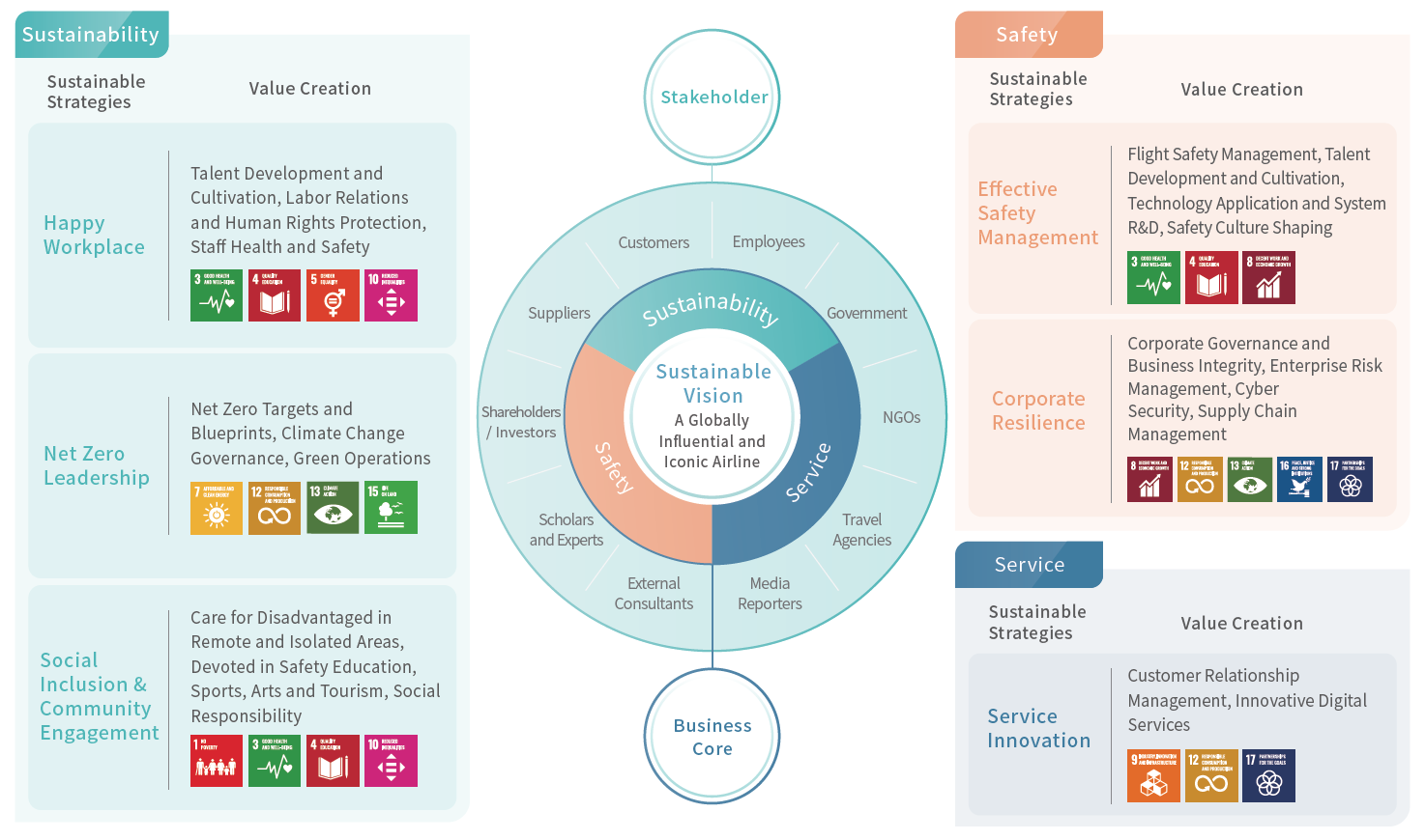 EVA Air’s sustainable development strategy centers on our operational core value “safety, service and sustainability”, and is linked to the economic, social and environmental aspects (ESG) of sustainable development. We have designed our six sustainability strategies to target the 13 SDGs. We aim to ensure safer flights, more sustainable environmental measures, better customer service, and a friendlier workplace environment; and we work together with our stakeholders to create the service environment needed for sustainable aviation. EVA Air encourages our partners to work with us to create sustainable aviation services and realize the dream of becoming a globally influential and iconic airline.